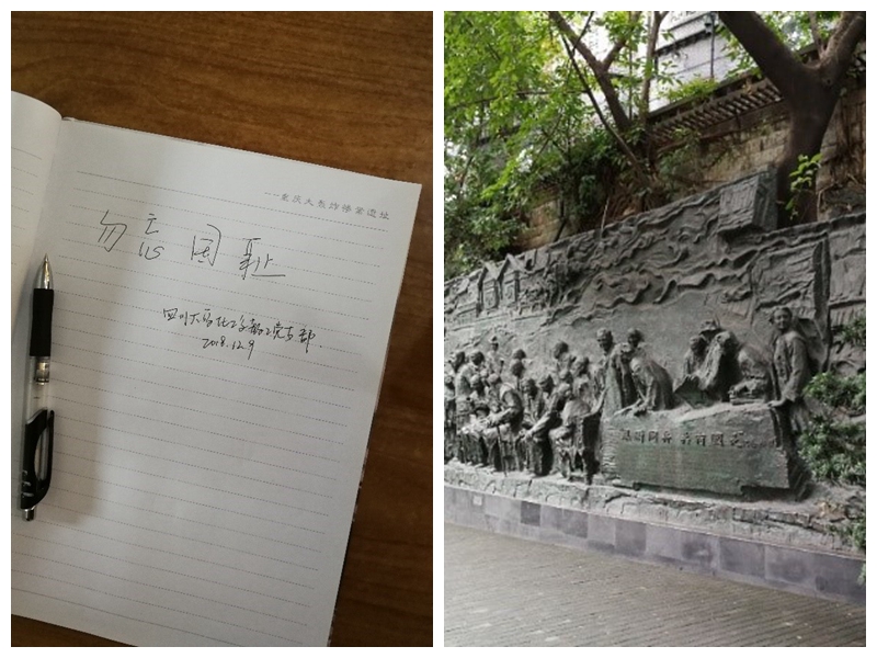 2018年12月9日,支部成员前往重庆大轰炸惨案遗址。1938年-1945年,重庆作为"国民政府"的陪都及政治、军事、文化中心,成为日军实施"以炸迫降"战略企图最主要的空袭目标。重庆大轰炸惨案遗址为了纪念在抗战期间空袭去世的人民而修建。当天下午,参观了桂园和特园中国民主党派立式陈列馆,桂园为著名的《双十协定》签订地点,重庆谈判期间,毛泽东同志在此接见民主人士。特园介绍了各民主党派的发展及它们与中国共产党风雨同舟、荣辱与共的光荣历史。在参观和学习中,我们充分认识到中国共产党领导的多党合作和政治协商制度的历史必然性,以及其伟大独创性和巨大优越性。我们作为楼凤