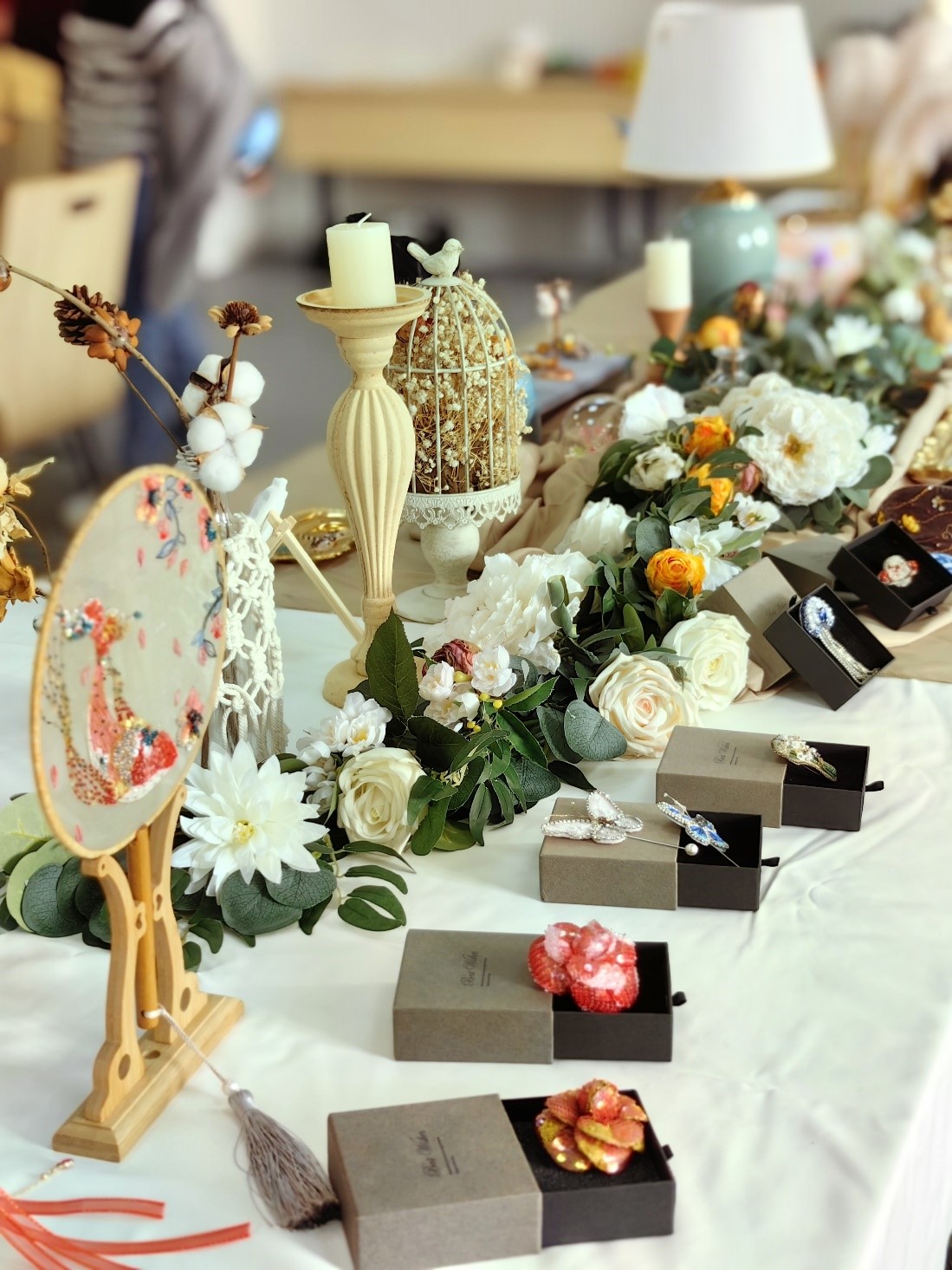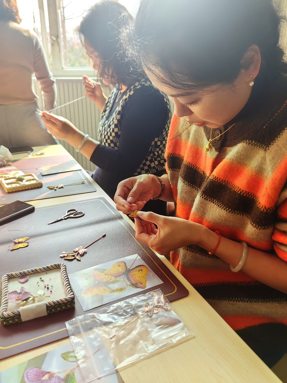 工会和吾同高定文化传播有限公司的大力支持,大家为活动的顺利开展精心布置场地,营造了温馨、高雅的氛围,让参与的女职工倍感亲切和愉悦。来自吾同高定文化传播有限公司的五位老师带领女职工们了解法式刺绣的历史和发展过程,学习品鉴法式刺绣作品,并现场制作精美的胸针。大家兴趣盎然、跃跃欲试,在老师们的指导下纷纷制作出了独一无二的作品。