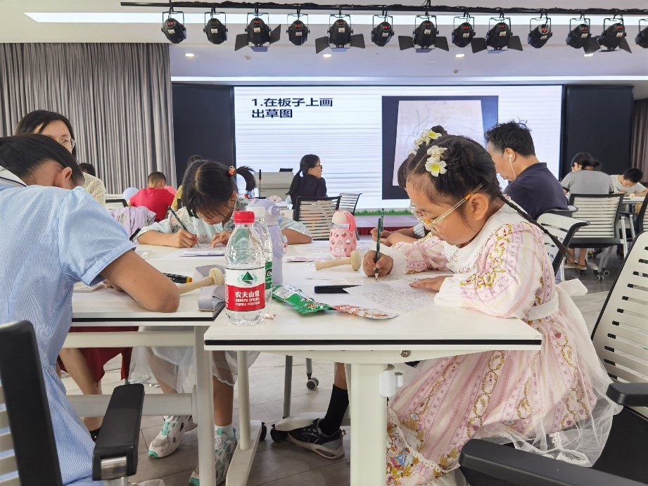 随后,在老师的指导下,小朋友们起稿,勾勒出简要的线条稿,接着拷贝,把画在纸上的画印到板上,紧接着进行刻制,最后再用调好的油墨,以油滚来回滚动使油墨均匀地粘于油滚上,在版上均匀滚墨。大家兴趣盎然,在老师们的指导下纷纷制作出了属于自己的版画作品。