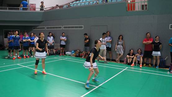 代表队。场上队员们奋勇拼搏,你争我夺,场下拉拉队鼓劲加油,声势浩大。我方的女双队员黄超群、张其翼凭借着丰富的比赛经验、默契的配合和过硬的球技,轻松取下第一场胜利。随后的男双比赛,郭孝东老师和吉俊懿老师虽是第一次配合比赛,但完全发挥出了自己的实力,抓住对手弱点发起猛攻,轻松取得了第一场胜利,打响了比赛开门红。随后的连续对战中,楼凤
