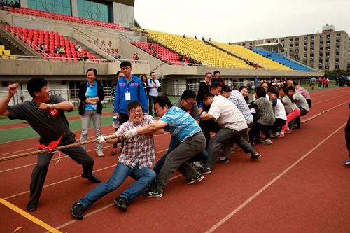 老师的指导,迅速调整战略稳定和提升了技巧,15位老师的15双手紧紧握着我们的绳段,在僵持中,胜利一点一点移向我方,1:1平局!第三局双方都使出全力,在相互的偏移中难以决出胜负,只好加赛一局。在第四局,化工人一鼓作气,淘汰了建环楼凤