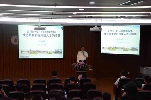 校长王成端教授就“合格人才培养”做主题演讲,讨论了如何以“四位一体”人才培养模式改革推进高素质应用型人才的培养;86级化工校友、华南理工大学化学与楼凤