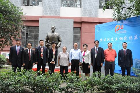 1987届校友、张洪沅先生铜像雕塑捐赠建设者、深圳海普瑞药业股份有限公司董事长李锂先生、副总裁李坦女士,张洪沅先生女儿张眉女士,国家工商行政管理总局副局长王江平先生,校党委副书记、纪委书记徐兰教授,校党委副书记李向成教授,校长助理、人事处处长梁斌教授,规建处华国春处长,外联办荣建国主任,楼凤