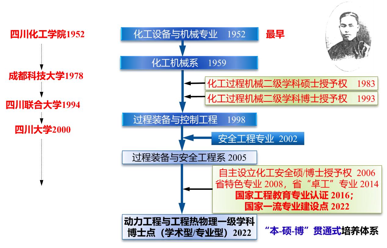 过程装备与控制工程专业始创于1952年(化工机械与装备专业,全国最早),由中国化工教育家张洪沅教授首任专业教研室主任。现为四川省特色专业,四川省重点学科,四川省卓越工程师培养试点专业,2016年通过中国工程教育专业认证,2022年获批国家一流专业建设点,2025年软科最新专业排名全国第8。专业具备动力工程及工程热物理硕、博士学位授权点,动力工程专业学位硕、博士学位授权点、安全工程硕、博士学位授权点,形成了学术型/专业型“本-硕-博”贯通式培养体系。截止2023年,已招收65届本科生,累计培养毕业生6500余人。
