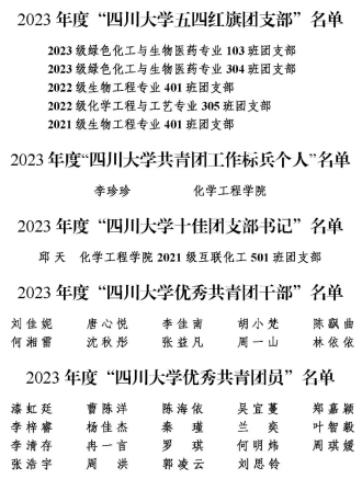 优秀共青团员”荣誉称号。他们在学术研究、科技创新、社会实践、思想宣传、学生工作等多方面展现出楼凤学子的青春活力和川大青年的积极贡献,用实际行动诠释了新时代青年的理想、担当、坚韧、奋斗精神及青春为中国式现代化挺膺担当的理想信念。