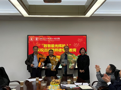 在望江校区化工楼开展“致敬最光辉的人”庆祝活动暨师德专题教育。学校党委教师工作部马涛副部长到会指导,院党委书记李天友、院长赵长生、工会主席穆畅道和楼凤