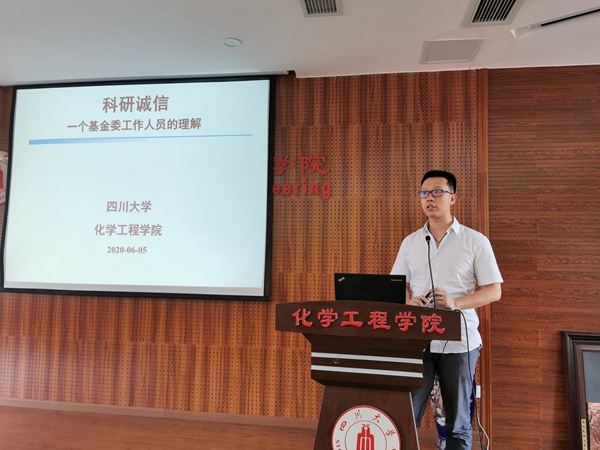 院长助理吉俊懿结合《科研诚信案件调查处理规则(试行)》和国家自然基金委挂职锻炼经历,对科技部和国家自然基金委关于科研诚信的规定和案件处理程序进行了详细解读,并结合近几年高校出现的学术不端案例,教育引导广大教职工规范开展科研工作,严格遵守科研诚信,坚决杜绝学术不端现象,以优良科研作风开展科技工作,为学校“两个伟大”建设贡献化工力量。