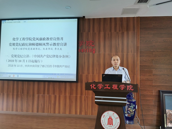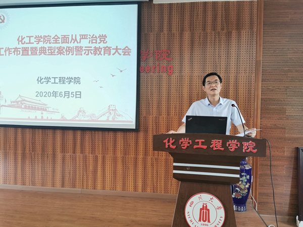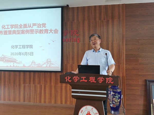 2020年全面从严治党工作要点。他说到,全院教师要一以贯之、坚定不移全面从严治党,强化对权力运行的制约和监督,保证党的路线方针政策和学校重大决策部署贯彻落实,为坚决打赢疫情防控阻击战,奋力推进中国特色、川大风格的世界一流大学建设和一流化工学科建设提供坚强保障。