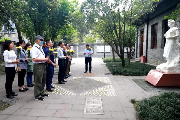 江姐雕像前,老师们胸戴党徽,手捧寄托哀思的黄菊,肃穆而立,向以江竹筠烈士为代表的川大英烈、向为中国人民解放事业和国家建设事业英勇献身的烈士默哀。