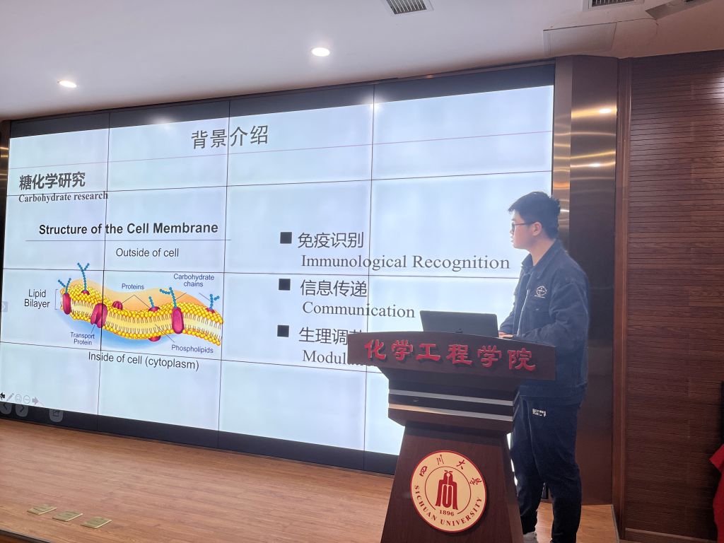 接着,在交流发言环节,研究生第六党支部入党积极分子、2021级博士研究生左昊同志结合自己的课题,介绍了糖类在免疫、细菌和病毒感染等生理病理过程中所发挥的不可或缺的作用以及糖化学的研究现状。 最近,他的研究成果最近在Nature Chemistry刊登。接着,结合自己科研工作中反复的尝试和论证精神,提出广大青年学子要主动担负时代的责任,不负时代,不负韶华,努力在科技创新上贡献力量。