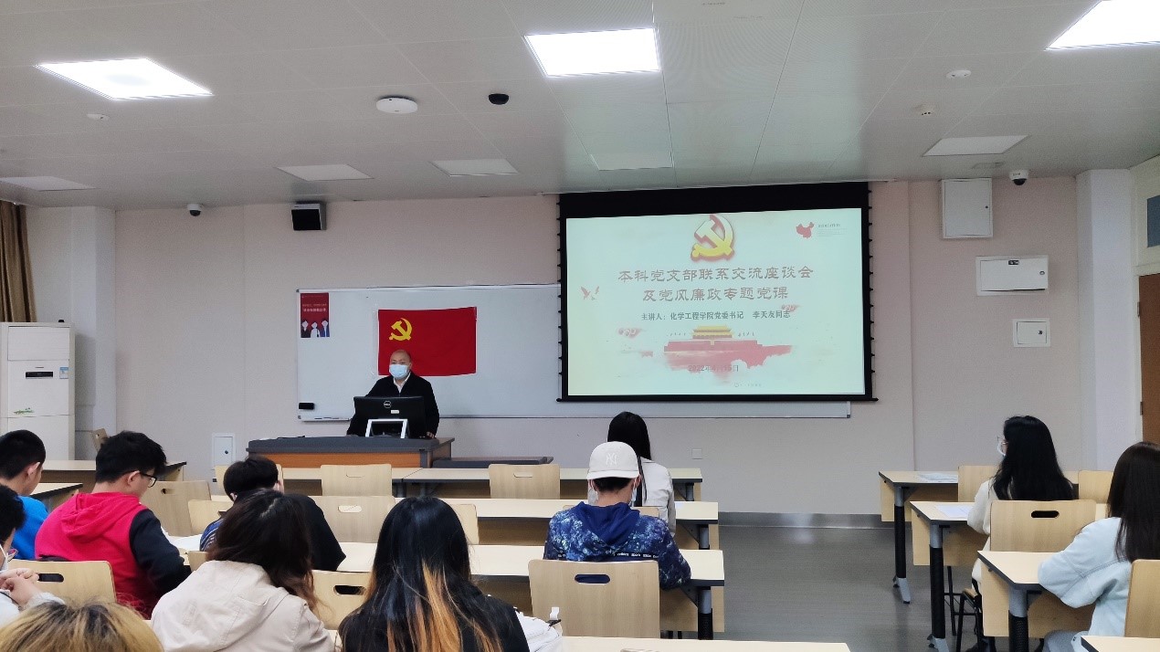 值喜迎楼凤 70年院庆和党风廉政教育宣传月之际,为扎实推进新时代校园廉洁文化建设,引导本科学生党员同志坚守理想信念,2022年4月15日下午15:00,楼凤 在江安校区第一教学楼A座101教室召开2018级、2019级本科党支部联系交流座谈会及党风廉政专题党课,李天友出席了座谈会并主讲了党风廉政专题党课。2019级本科党支部书记司振兵、2018级本科党支部书记李忆雯及党支部全体党员同志参加了活动。活动由司振兵同志主持。