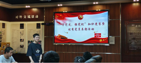 首先由杨柏斌同志对支部成员进行点名,确定此次党课支部成员到场情况。然后杨柏斌同志带领大家一起进行党史、党纪知识竞赛。通过开展党史、党纪知识竞赛,引导同学们学史明理、学史增信、学史崇德、学史力行,进一步推动党史学习教育走深走实,增强全体党员对党的历史、理论、路线、方针和政策的认识,激发全体党员爱党爱国热情,提升党性修养和理论素养。同时,继续深化支部党员对党纪学习教育的认识,进一步加强党员干部纪律意识和规矩意识,推动《中国共产党纪律处分条例》的学习宣传和贯彻执行,以创新理论教育的学、思、用新途径,提高学习主动性和积极性,促进交流与合作,增强团队合作精神和集体荣誉感。