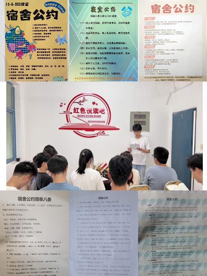 江姐班学生寝室-8舍9单元201室),学生党员以问题为导向,分层分类学习《条例》,不仅要求学生党员严格规范自身行为,还须带动寝室同学增强纪律意识,形成寝室公约。以“寝室公约”为尺来约束学生行为,促进学生养成遵纪守法的好习惯。
