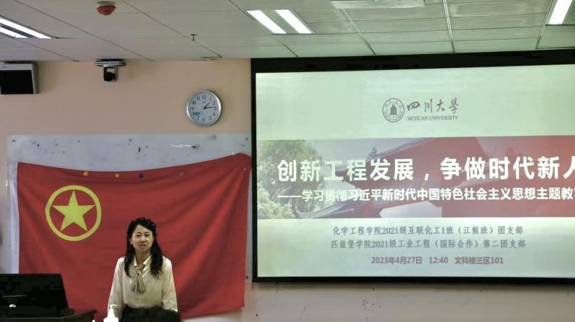 互联化工1班团支部书记邱天和工业工程(国际合作)第二团支部副团支书赵璘睿同学围绕两团支部专业的相似性与共通性,聚焦各自专业特色,以“创新工程发展,争做时代新人”为话题展开分享。邱天同学分享说:“互联化工是新工科改革背景下的工科专业,致力于培养信息+交叉复合型人才,并且作为江姐班,我们要做好红色传承和賡续的典范,将以江姐精神为重点的红色基因不断传承下去。”赵璘睿同学分享说:“工业工程专业承担着国际合作的重任,致力于打造宽广国际化视野、能适应国际化竞争环境的优秀工程师。