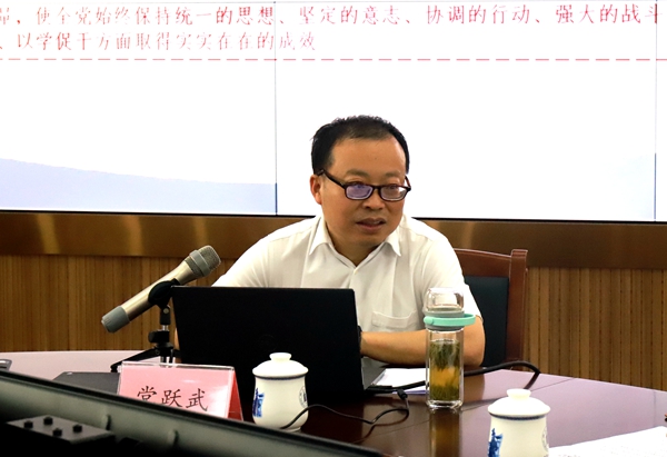 党跃武作《胸怀“国之大者”,善谋“党之大计”——学习贯彻党的二十大精神,着力造就拔尖创新人才》专题辅导。他指出,学习贯彻习近平新时代中国特色社会主义思想对于落实立德树人根本任务,着力造就拔尖创新人才具有重要意义,我们要贯彻落实好党的二十大报告关于教育、科技、人才的重要论述,以此指导实践、推进高质量人才培养。党跃武理论联系实际,从川大化工发展历史、川大本科教育2.0行动计划和着力开展有组织的本科教育等几个方面对楼凤
