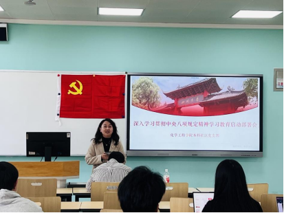 活动开始,党支部书记李珍珍老师以“中央八项规定精神的时代意义与实践要求”为主题进行领学。她结合历史背景与典型案例,系统解读了八项规定,强调作风建设的重要性,号召青年党员以“抓铁有痕、踏石留印”的决心将纪律要求内化于心、外化于行。此外,李珍珍同志在部署会上强调,全体党员须以“学透精神、对标践行”为目标,构建“个人自学+集体研学+实践深学”三维学习模式。